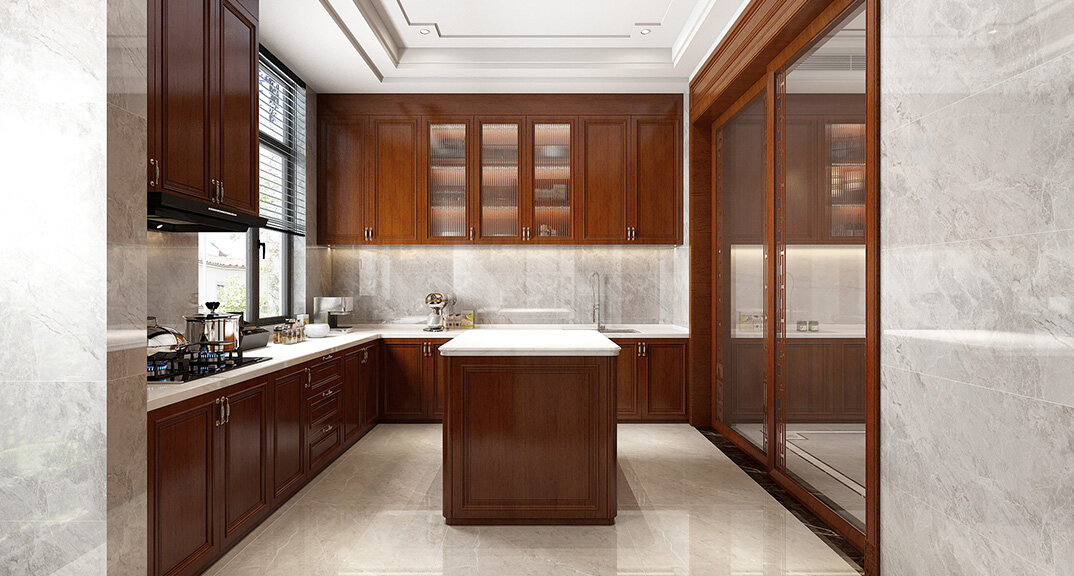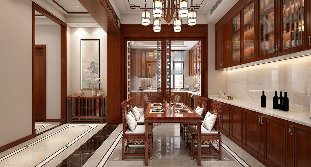 嶗山官邸1000㎡別墅一樓廚房新中式風(fēng)格裝修案例效果圖