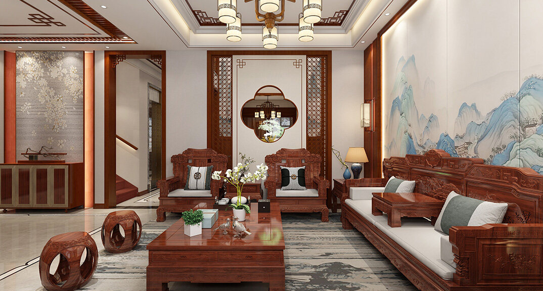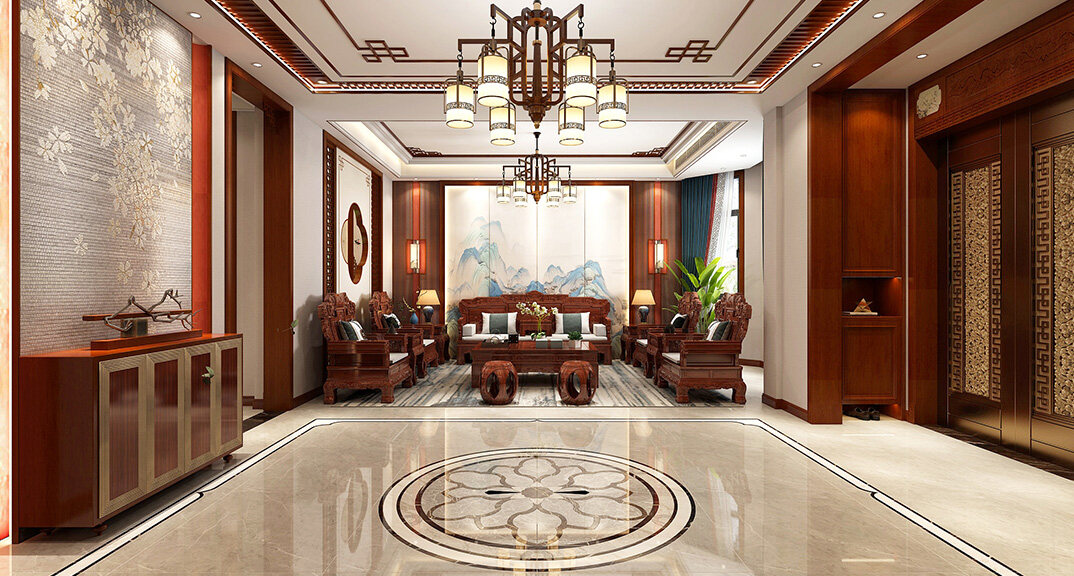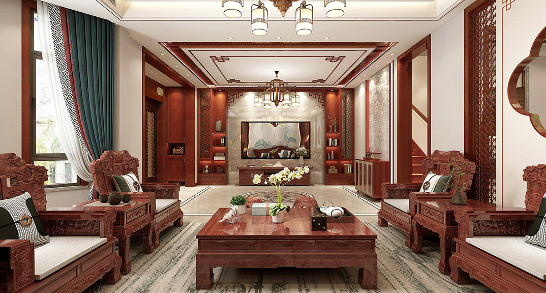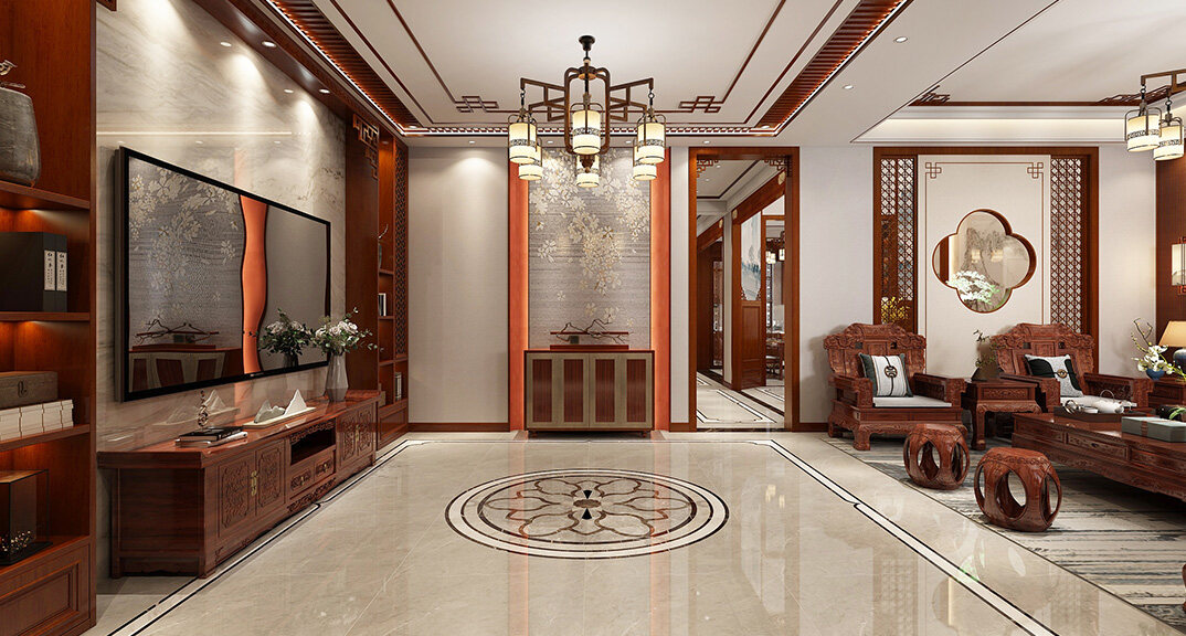 嶗山官邸1000㎡別墅一樓客廳新中式風(fēng)格裝修案例效果圖