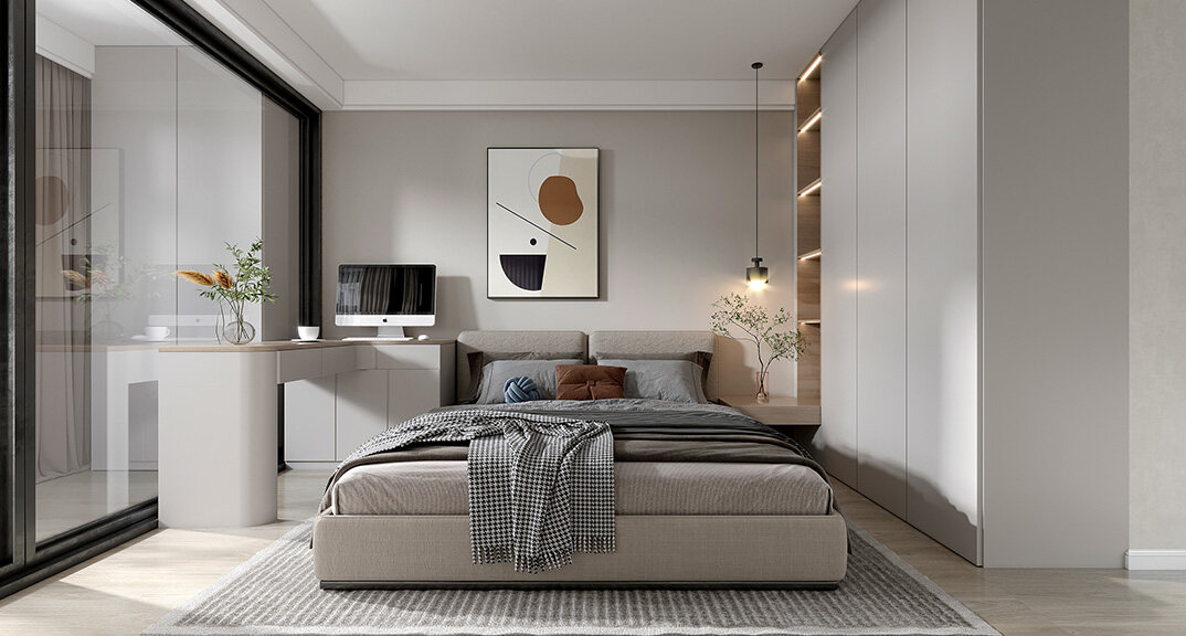 南京路老房翻新123㎡三室一廳臥室輕奢風(fēng)格裝修案例效果圖