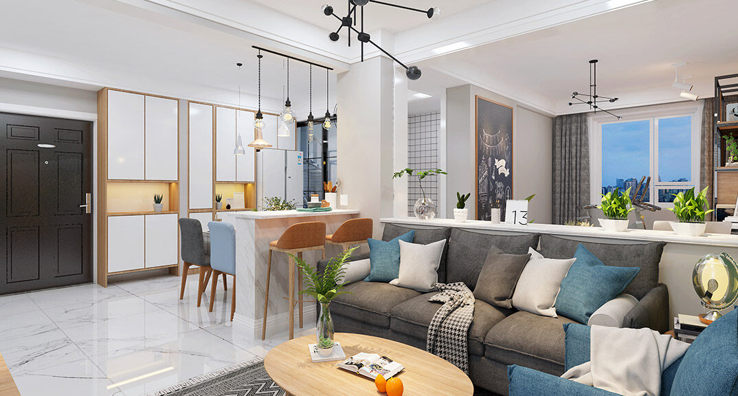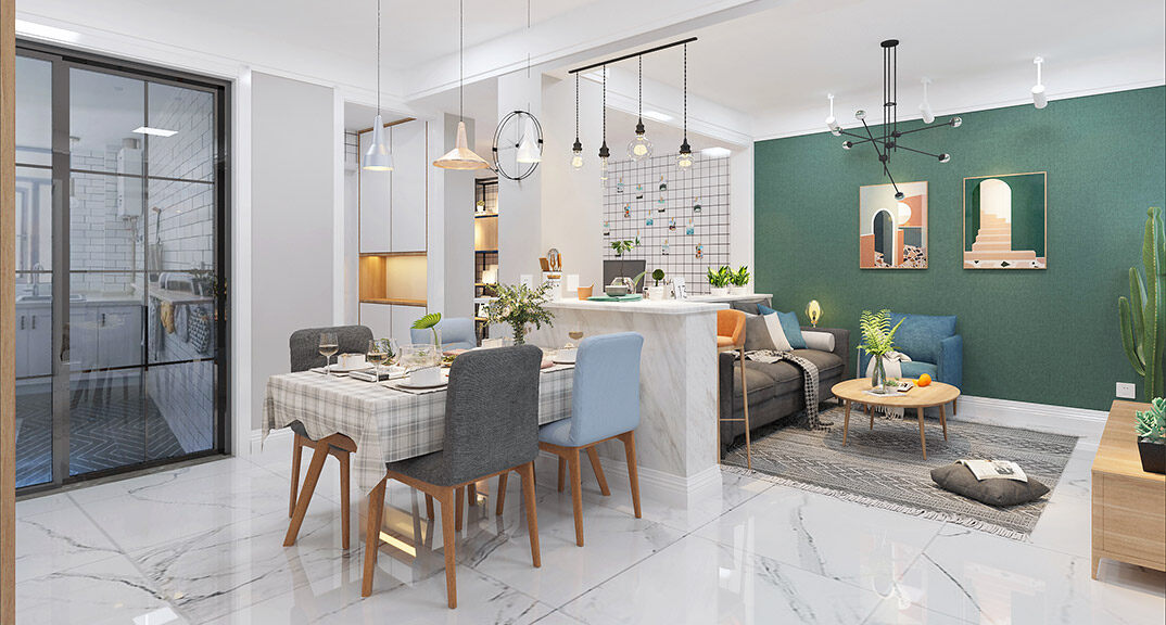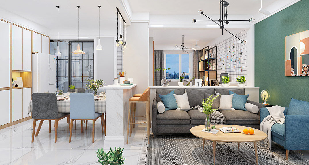 萊頓小鎮(zhèn)·瀾海郡125㎡三室兩廳客餐廳北歐風格裝修案例效果圖