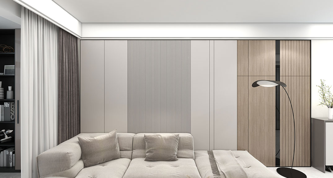本案設(shè)計風(fēng)格為意式輕奢,拒絕了濃烈的色彩,以一種簡單、純粹的設(shè)計語言,回歸生活的本質(zhì),留存給居住者更多生活想象的空間。 整體空間灰橙色、駝色、與淺暖灰色調(diào)展現(xiàn)輕奢低調(diào)的高級質(zhì)感,簡約時尚的家具又增添了一份現(xiàn)代感,重新梳理了空間功能和尺寸,客廳陽臺一體化設(shè)計,最大限度引入自然光,高級灰搭配中性色系木飾面,打造一個舒適的高品質(zhì)空間。在空間設(shè)計與色彩配搭上,精準(zhǔn)地把控節(jié)奏,用設(shè)計表達空間的包容性,更多的是通過人性化思考,創(chuàng)造一個功能性完整的舒適生活空間。大塊的木飾面、金屬元素和燈 光的碰撞搭配,凸顯出強大張力,共同打造出意式輕奢腔調(diào)十足的時尚與質(zhì)感。