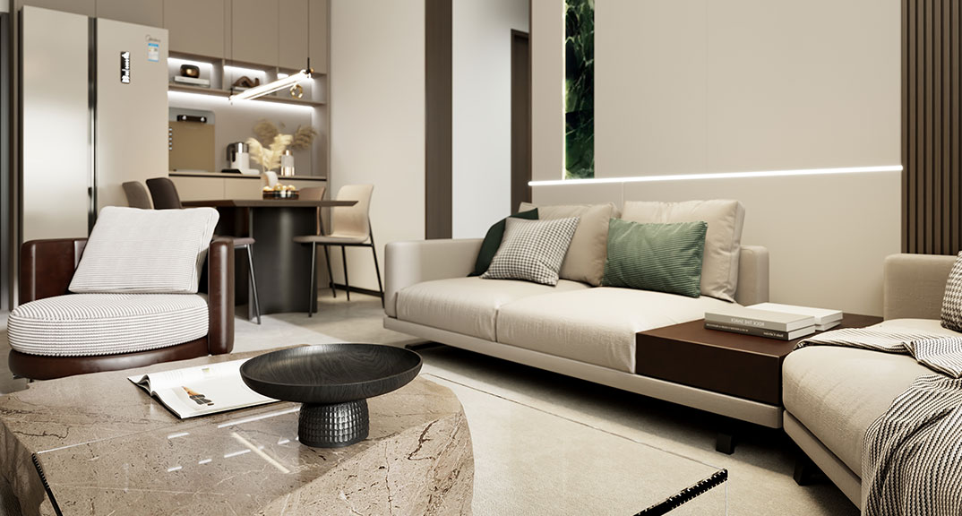 本案設(shè)計(jì)風(fēng)格為意式輕奢,拒絕了濃烈的色彩,以一種簡(jiǎn)單、純粹的設(shè)計(jì)語(yǔ)言,回歸生活的本質(zhì),留存給居住者更多生活想象的空間。 整體空間灰橙色、駝色、與淺暖灰色調(diào)展現(xiàn)輕奢低調(diào)的高級(jí)質(zhì)感,簡(jiǎn)約時(shí)尚的家具又增添了一份現(xiàn)代感,重新梳理了空間功能和尺寸,客廳陽(yáng)臺(tái)一體化設(shè)計(jì),最大限度引入自然光,高級(jí)灰搭配中性色系木飾面,打造一個(gè)舒適的高品質(zhì)空間。在空間設(shè)計(jì)與色彩配搭上,精準(zhǔn)地把控節(jié)奏,用設(shè)計(jì)表達(dá)空間的包容性,更多的是通過人性化思考,創(chuàng)造一個(gè)功能性完整的舒適生活空間。大塊的木飾面、金屬元素和燈 光的碰撞搭配,凸顯出強(qiáng)大張力,共同打造出意式輕奢腔調(diào)十足的時(shí)尚與質(zhì)感。
