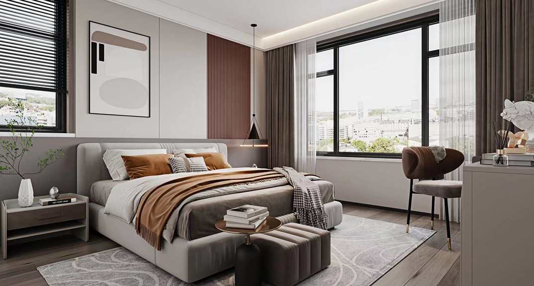 本案設(shè)計(jì)風(fēng)格為意式輕奢,拒絕了濃烈的色彩,以一種簡單、純粹的設(shè)計(jì)語言,回歸生活的本質(zhì),留存給居住者更多生活想象的空間。 整體空間灰橙色、駝色、與淺暖灰色調(diào)展現(xiàn)輕奢低調(diào)的高級質(zhì)感,簡約時(shí)尚的家具又增添了一份現(xiàn)代感,重新梳理了空間功能和尺寸,客廳陽臺一體化設(shè)計(jì),最大限度引入自然光,高級灰搭配中性色系木飾面,打造一個舒適的高品質(zhì)空間。在空間設(shè)計(jì)與色彩配搭上,精準(zhǔn)地把控節(jié)奏,用設(shè)計(jì)表達(dá)空間的包容性,更多的是通過人性化思考,創(chuàng)造一個功能性完整的舒適生活空間。大塊的木飾面、金屬元素和燈 光的碰撞搭配,凸顯出強(qiáng)大張力,共同打造出意式輕奢腔調(diào)十足的時(shí)尚與質(zhì)感。