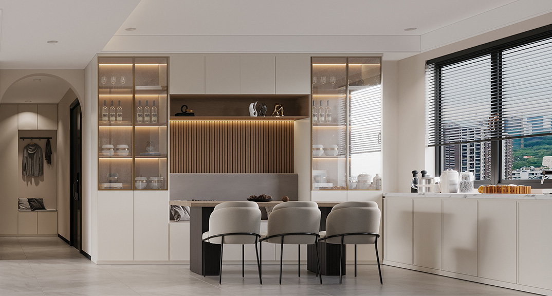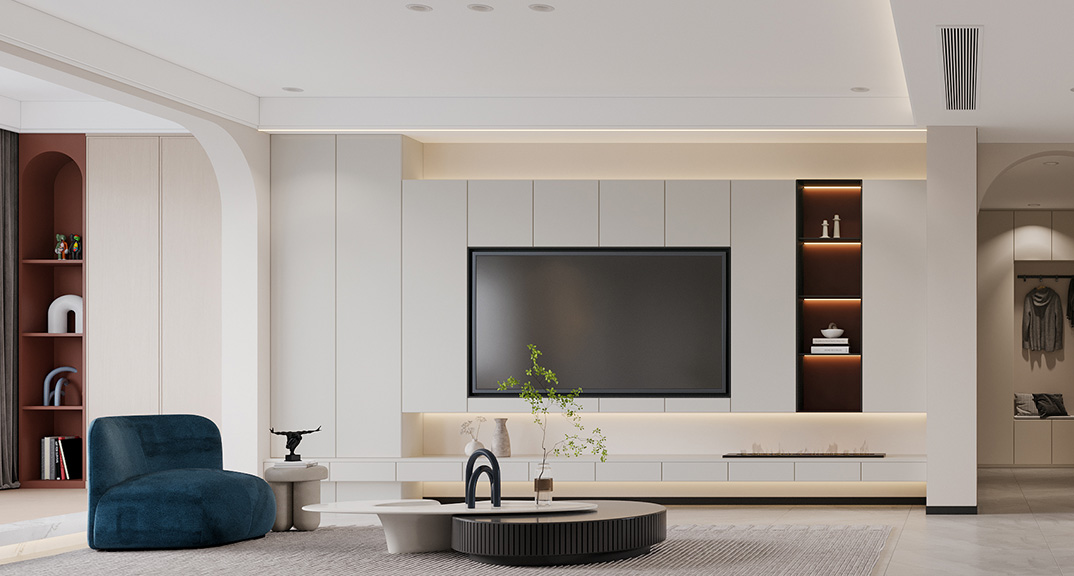 本案整體以現(xiàn)代中式風(fēng)格為主,既有現(xiàn)代風(fēng)格簡(jiǎn)約、明朗的線條,又有中國(guó)傳統(tǒng)內(nèi)涵與韻味。墻面大面積使用暖色烘托整體氛圍,融洽中式與現(xiàn)代簡(jiǎn)約兩種風(fēng)格??臻g更寬闊舒適玄關(guān)收納、玄關(guān)與干區(qū)相結(jié)合,既解放的外衛(wèi)的空間客廳電視背景是一面裝飾柜,豐富了空間,增加了收納和儲(chǔ)物,美觀又實(shí)用。