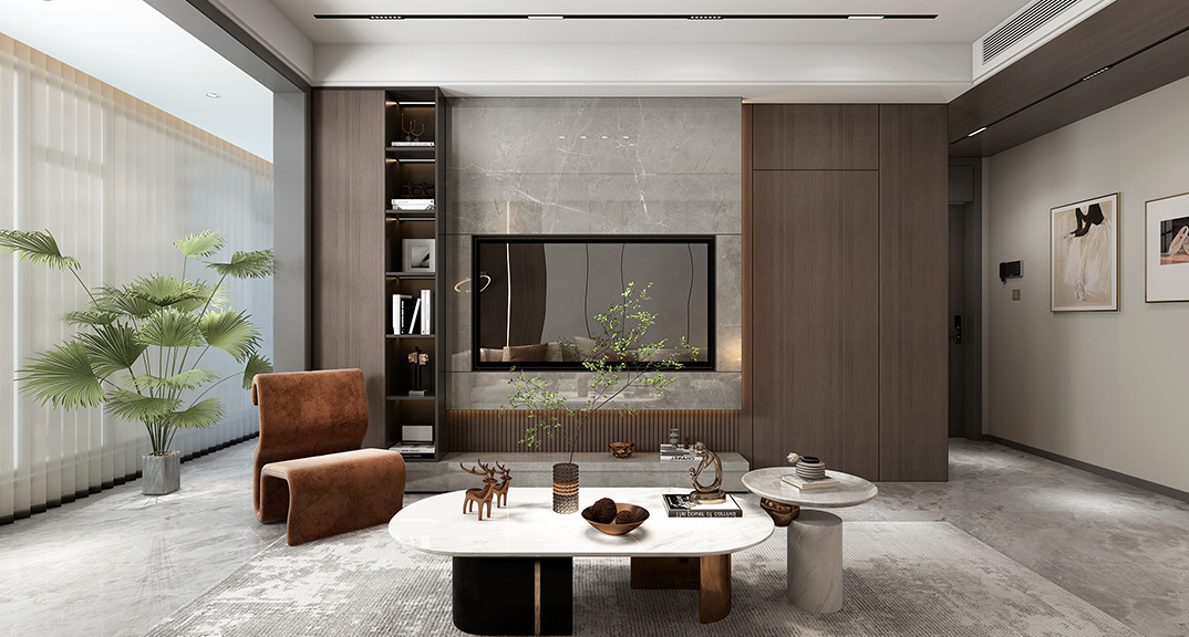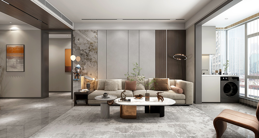 本案設(shè)計(jì)風(fēng)格為意式輕奢,拒絕了濃烈的色彩,以一種簡單、純粹的設(shè)計(jì)語言,回歸生活的本質(zhì),留存給居住者更多生活想象的空間。 整體空間灰橙色、駝色、與淺暖灰色調(diào)展現(xiàn)輕奢低調(diào)的高級質(zhì)感,簡約時(shí)尚的家具又增添了一份現(xiàn)代感,重新梳理了空間功能和尺寸,客廳陽臺一體化設(shè)計(jì),最大限度引入自然光,高級灰搭配中性色系木飾面,打造一個(gè)舒適的高品質(zhì)空間。在空間設(shè)計(jì)與色彩配搭上,精準(zhǔn)地把控節(jié)奏,用設(shè)計(jì)表達(dá)空間的包容性,更多的是通過人性化思考,創(chuàng)造一個(gè)功能性完整的舒適生活空間。大塊的木飾面、金屬元素和燈 光的碰撞搭配,凸顯出強(qiáng)大張力,共同打造出意式輕奢腔調(diào)十足的時(shí)尚與質(zhì)感。