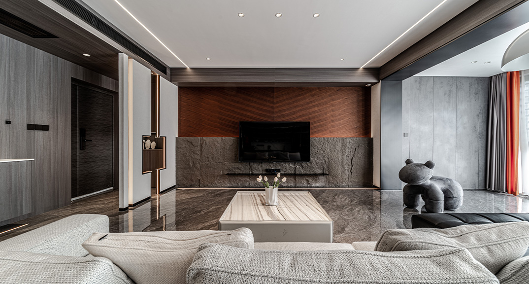 本案設(shè)計(jì)風(fēng)格為意式輕奢,拒絕了濃烈的色彩,以一種簡(jiǎn)單、純粹的設(shè)計(jì)語(yǔ)言,回歸生活的本質(zhì),留存給居住者更多生活想象的空間。 整體空間灰橙色、駝色、與淺暖灰色調(diào)展現(xiàn)輕奢低調(diào)的高級(jí)質(zhì)感,簡(jiǎn)約時(shí)尚的家具又增添了一份現(xiàn)代感,重新梳理了空間功能和尺寸,客廳陽(yáng)臺(tái)一體化設(shè)計(jì),最大限度引入自然光,高級(jí)灰搭配中性色系木飾面,打造一個(gè)舒適的高品質(zhì)空間。在空間設(shè)計(jì)與色彩配搭上,精準(zhǔn)地把控節(jié)奏,用設(shè)計(jì)表達(dá)空間的包容性,更多的是通過(guò)人性化思考,創(chuàng)造一個(gè)功能性完整的舒適生活空間。大塊的木飾面、金屬元素和燈 光的碰撞搭配,凸顯出強(qiáng)大張力,共同打造出意式輕奢腔調(diào)十足的時(shí)尚與質(zhì)感。