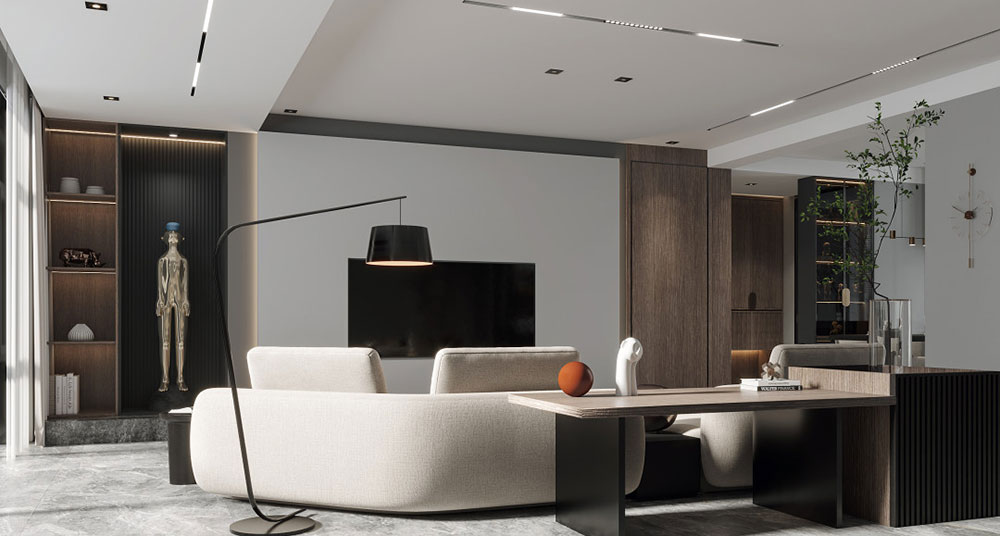 本案設(shè)計(jì)風(fēng)格為意式輕奢,拒絕了濃烈的色彩,以一種簡單、純粹的設(shè)計(jì)語言,回歸生活的本質(zhì),留存給居住者更多生活想象的空間。 整體空間灰橙色、駝色、與淺暖灰色調(diào)展現(xiàn)輕奢低調(diào)的高級質(zhì)感,簡約時(shí)尚的家具又增添了一份現(xiàn)代感,重新梳理了空間功能和尺寸,客廳陽臺一體化設(shè)計(jì),最大限度引入自然光,高級灰搭配中性色系木飾面,打造一個(gè)舒適的高品質(zhì)空間。在空間設(shè)計(jì)與色彩配搭上,精準(zhǔn)地把控節(jié)奏,用設(shè)計(jì)表達(dá)空間的包容性,更多的是通過人性化思考,創(chuàng)造一個(gè)功能性完整的舒適生活空間。大塊的木飾面、金屬元素和燈 光的碰撞搭配,凸顯出強(qiáng)大張力,共同打造出意式輕奢腔調(diào)十足的時(shí)尚與質(zhì)感。