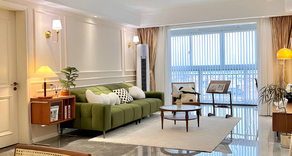 簡約而實用的搭配是這個家的特點??蛷d裝飾以大白墻和綠色沙發(fā)為主,背景墻選用了奶油色實木家具,為整個空間增添了溫馨舒適的氛圍。柔軟舒適的沙發(fā)和地毯進一步提升了美觀大氣的效果。天花板采用了無主燈的大平頂設(shè)計,創(chuàng)造出簡約而高級的感覺。為了提供充足的采光和廣闊的視野,客廳摒棄了陽臺,而是選擇了落地窗封閉,這樣不僅增加了室內(nèi)采光,還提高了空間的利用率。整個裝修采用了開放式設(shè)計,使得空間更加開闊明亮,方便客廳和其他區(qū)域之間的交流和互動。主臥室的床頭墻只刷了一面柔和的奶咖色乳膠漆,這不僅經(jīng)濟實惠,而且給人一種溫馨舒適的感覺。主臥繼承了整個房間的設(shè)計風格,同樣采用了無主燈的大平頂設(shè)計。床頭背景墻上半部分使用清爽的乳膠漆,下半部分則嵌入了燈帶,與懸浮式床頭柜采用一體化設(shè)計的飾面板相呼應(yīng)。