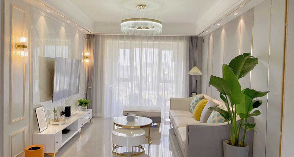 客廳的設(shè)計具有時尚輕奢的特點(diǎn),雖然不大,但極具品味,能夠完美展現(xiàn)高貴的風(fēng)格。沙發(fā)背景墻采用護(hù)墻板與金屬條相結(jié)合的方式,搭配吊頂上的金屬條,散發(fā)出閃閃發(fā)光的金色光芒,讓人感受到金碧輝煌的錯覺。沙發(fā)和茶幾都鑲嵌有金色邊條,整體搭配完美統(tǒng)一,時尚而奢華。陽臺的落地窗保證了充足的采光,在陽光明媚的日子里,客廳更顯得格外豪華。電視背景墻采用石膏板與巖板組合,時尚大氣,電視柜上選擇了金色柜腳,可伸縮設(shè)計,與背景墻形成更加完美的融合。由于地面是地磚,沙發(fā)、茶幾和電視柜都有金屬腳,因此在沙發(fā)和電視柜下方加裝了軟墊,而茶幾只能鋪設(shè)地毯。