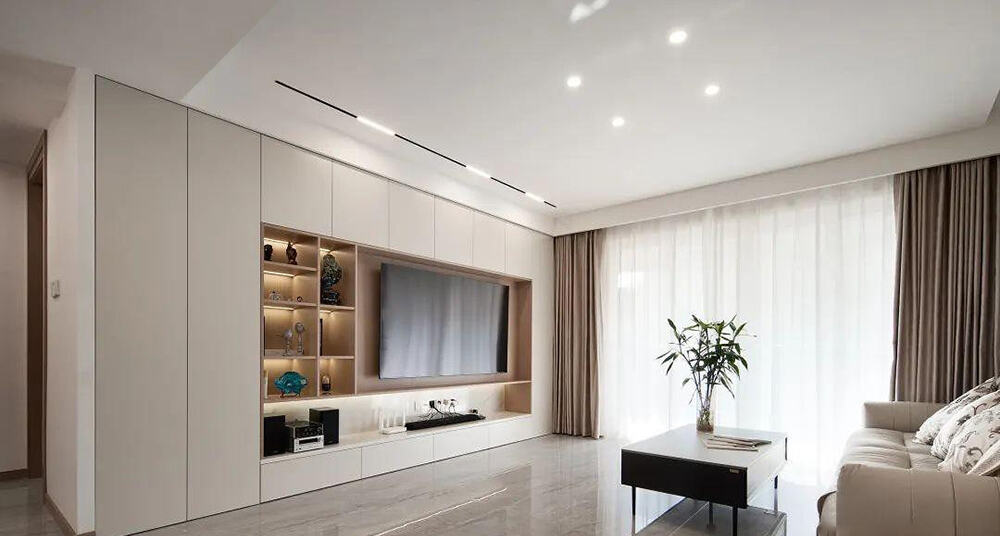 根據(jù)本案業(yè)主為一對(duì)年輕夫婦,且父母住在同一小區(qū)的情況,考慮到夫婦二人日常上班繁忙且渴望擁有一處能夠沉淀心靈的生活空間的愿望,我們在設(shè)計(jì)中采用了大量簡約明朗的線條,并合理分隔了空間。顏色方面,我們主要以白色和木色為主,力求使居室環(huán)境保持簡潔純粹。 客廳部分,我們采用了以射燈為主光源的無主燈設(shè)計(jì),電視背景采用開閉有序的收納柜,柜內(nèi)隱藏的光源為空間烘托出柔和的氛圍。每個(gè)角落都規(guī)劃了自由插座,以提升整個(gè)居室的便利性,這對(duì)業(yè)主的生活來說尤為重要。寬闊明朗的客廳空間能夠讓人心情不自覺地變得輕松舒暢。在以白色為底色的居室中,我們巧妙地融入了木材的溫潤,完美地展現(xiàn)了夫婦二人自在隨性的生活方式。沙發(fā)背景墻采用木飾面結(jié)合木格柵,營造出純凈的自然氣息,為家庭打造了舒適的氛圍。整體的干凈塊面使視覺感受變得輕盈透明,同時(shí)隱形門的設(shè)計(jì)也使空間布局更加統(tǒng)一。餐廳部分,我們簡約而具有格調(diào)地?cái)[放了桌椅,角落處的綠植成為空間的靈性點(diǎn)綴,靜靜地傳達(dá)出安逸的視覺感受。廚房方面,由于原有廚房的層高較低,我們利用高低差的扣板吊頂進(jìn)行了一定的延伸,使整個(gè)空間的觀感變得開闊明亮。深灰色的櫥柜門賦予空間獨(dú)特的質(zhì)感,在保持明亮的同時(shí),也呈現(xiàn)出簡約明晰的秩序。臥室部分,我們延續(xù)了柔和的色彩,打造出舒緩的睡眠空間。