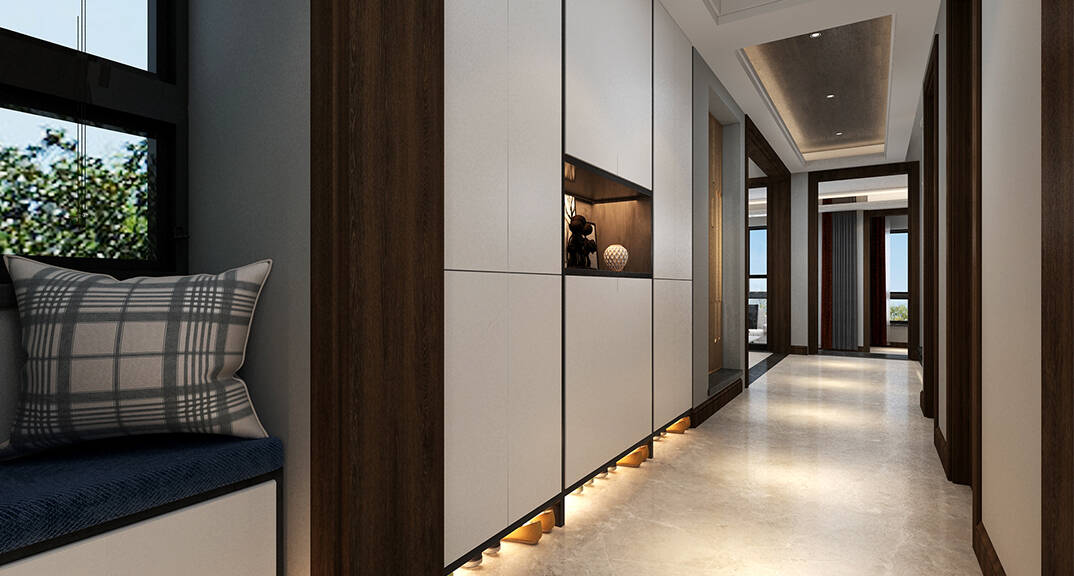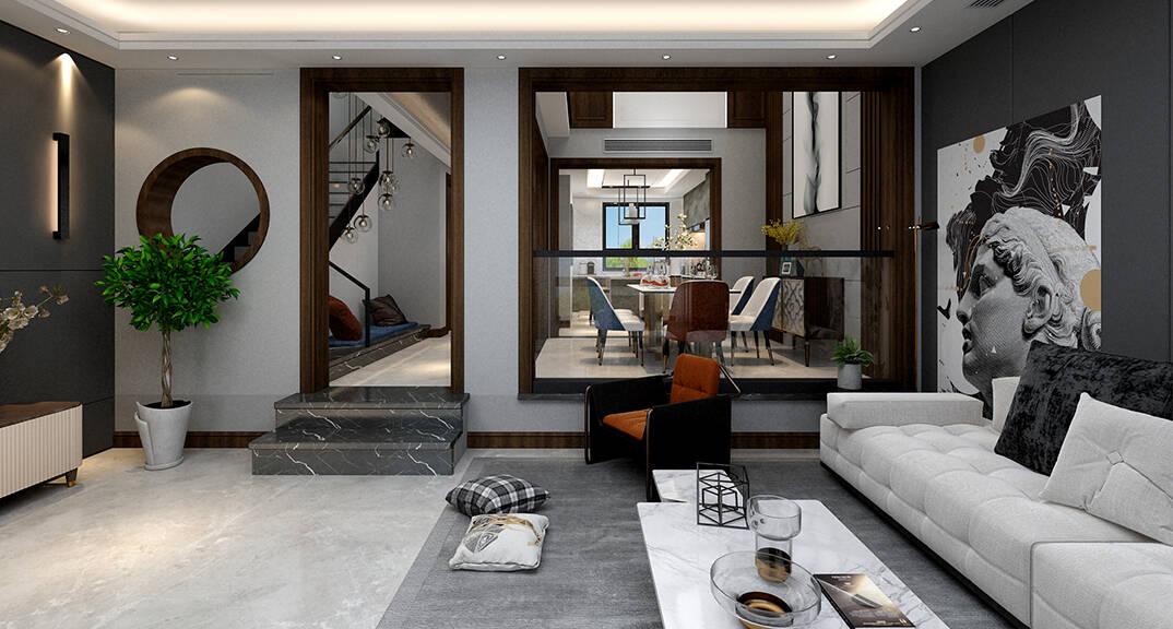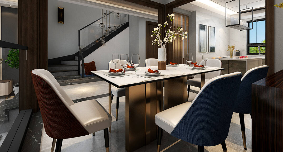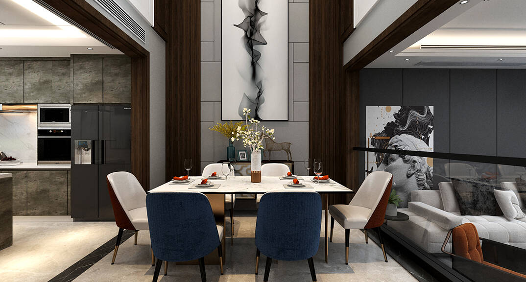 客餐廳空間在整體極簡(jiǎn)和雅的氣質(zhì)中,不同層次的木色、白色、灰色和諧相融;軟包、瓷磚、金屬、皮布等現(xiàn)代風(fēng)格材質(zhì),構(gòu)塑空間高雅大氣的當(dāng)代調(diào)性。