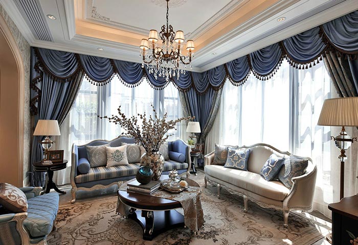 在法式裝飾中,使用木棉印花布配以各種花卉圖案的窗簾、手工制作的毛織品、粗花呢、麻紗織物等來裝飾房間。擺放各種鮮花和綠色植物,與優(yōu)雅的法國家具和精致的枝形吊燈相得益彰,營造出自然、舒適、環(huán)保、芬芳的氛圍。