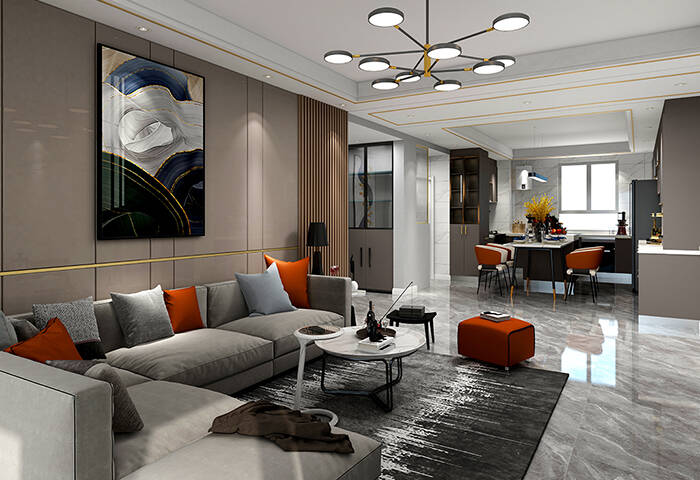 本案設(shè)計(jì)風(fēng)格為意式輕奢,拒絕了濃烈的色彩,以一種簡單、純粹的設(shè)計(jì)語言,回歸生活的本質(zhì),留存給居住者更多生活想象的空間。 整體空間灰橙色、駝色、與淺暖灰色調(diào)展現(xiàn)輕奢低調(diào)的高級質(zhì)感,簡約時(shí)尚的家具又增添了一份現(xiàn)代感,重新梳理了空間功能和尺寸,客廳陽臺(tái)一體化設(shè)計(jì),最大限度引入自然光,高級灰搭配中性色系木飾面,打造一個(gè)舒適的高品質(zhì)空間。在空間設(shè)計(jì)與色彩配搭上,精準(zhǔn)地把控節(jié)奏,用設(shè)計(jì)表達(dá)空間的包容性,更多的是通過人性化思考,創(chuàng)造一個(gè)功能性完整的舒適生活空間。大塊的木飾面、金屬元素和燈 光的碰撞搭配,凸顯出強(qiáng)大張力,共同打造出意式輕奢腔調(diào)十足的時(shí)尚與質(zhì)感。