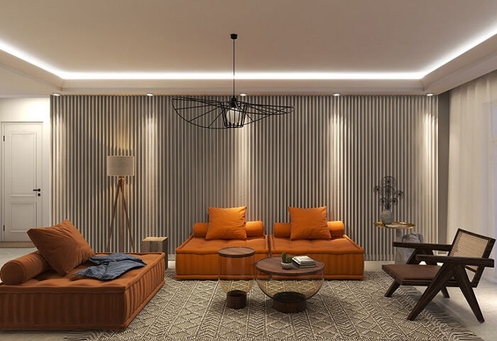 本案設(shè)計(jì)風(fēng)格為意式輕奢,拒絕了濃烈的色彩,以一種簡單、純粹的設(shè)計(jì)語言,回歸生活的本質(zhì),留存給居住者更多生活想象的空間。 整體空間灰橙色、駝色、與淺暖灰色調(diào)展現(xiàn)輕奢低調(diào)的高級質(zhì)感,簡約時尚的家具又增添了一份現(xiàn)代感,重新梳理了空間功能和尺寸,客廳陽臺一體化設(shè)計(jì),最大限度引入自然光,高級灰搭配中性色系木飾面,打造一個舒適的高品質(zhì)空間。在空間設(shè)計(jì)與色彩配搭上,精準(zhǔn)地把控節(jié)奏,用設(shè)計(jì)表達(dá)空間的包容性,更多的是通過人性化思考,創(chuàng)造一個功能性完整的舒適生活空間。大塊的木飾面、金屬元素和燈 光的碰撞搭配,凸顯出強(qiáng)大張力,共同打造出意式輕奢腔調(diào)十足的時尚與質(zhì)感。